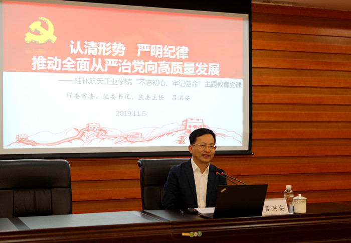 为进一步推进主题教育的深入开展,11月5日下午,学校邀请到了桂林市委常委、纪委书记、监委主任吕洪安来校,为我校广大党员干部上了一堂主题为《认清形势 严明纪律 推动全面从严治党向高质量发展》的专题廉政党课,进一步强化了广大党员干部全面从严治党,筑牢拒腐防变的思想防线。在家校领导,全体中层干部(含非领导职务),各党总支部、直属党支部纪检委员,纪委办、监察处全体人员聆听了本次报告。报告由党委书记李幼平主持。