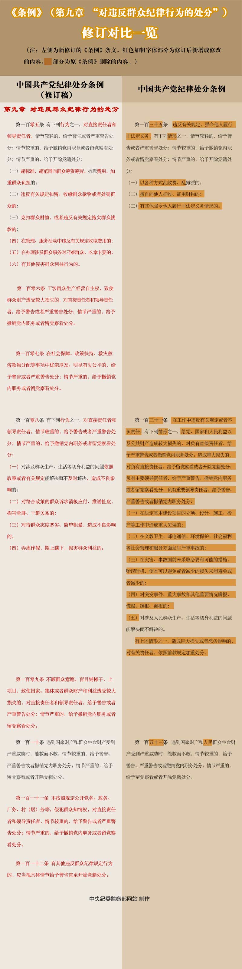 《条例》第九章“对违反群众纪律行为的处分”,主要对破坏党同人民群众血肉联系的违纪行为作出处分规定,完善了超标准、超范围向群众筹资筹劳,在办理涉及群众事务时故意刁难、吃拿卡要,在社会保障、政策扶持、救灾救济款物分配等事项中优亲厚友、显失公平等侵害群众利益行为的违纪条款;增加了不按规定公开党务、政务、厂务、村(居)务等侵犯群众知情权行为的违纪条款。
